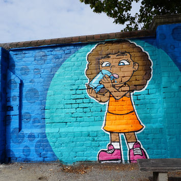 The two walls and stage were very warn and dull, We was asked to come up with another woodland theme that merged from season to season. Due to a lot of the children living in high rise building and not having a garden or woodland, we felt this mural would give the children their own woodland and see the flowers and animals they would see in real life, which went down well with the kids and parents. We was also asked to come up with a design that would encourage children to drink more water and revamp an old stag backdrop that was falling apart to help reingage the children to do more talent shows.