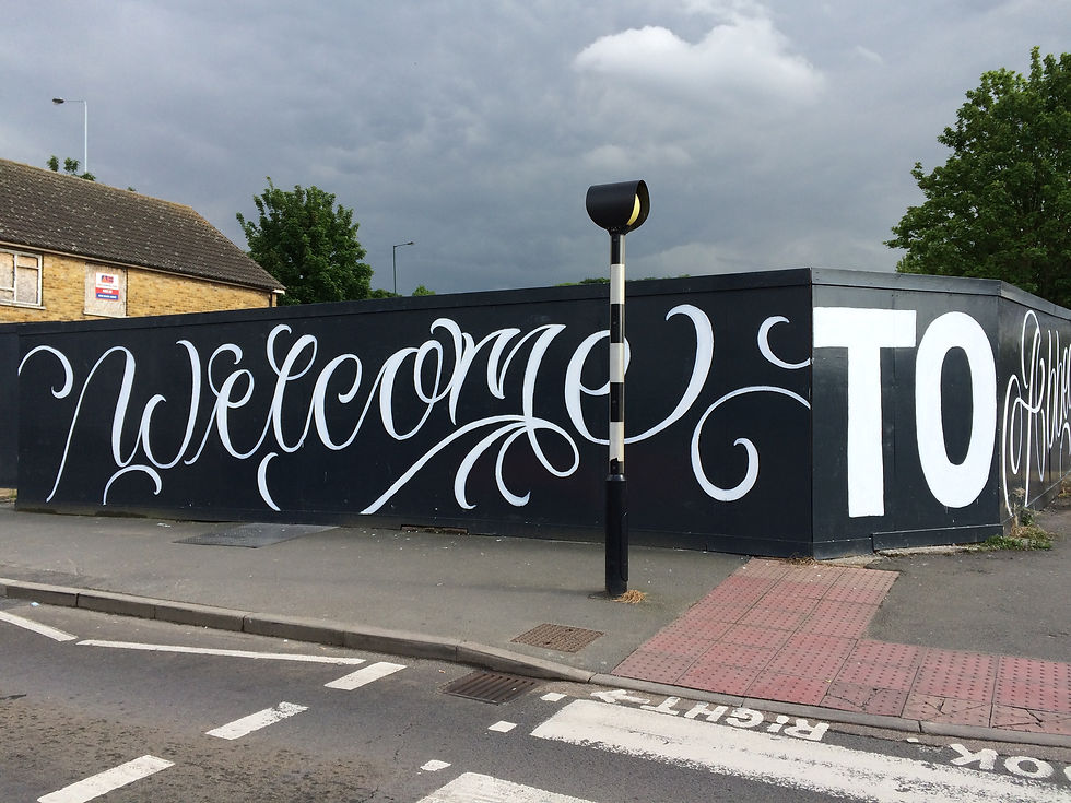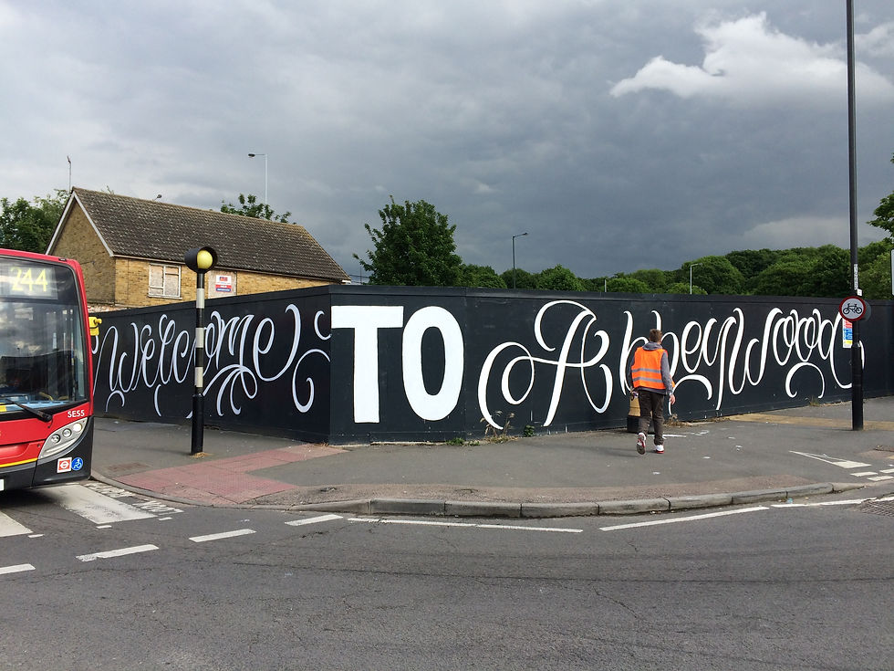 So we was approached by the owner of the construction company that has taken on the site and was asked to paint an artistic welcome message by our tattoo inspired typographer to help improve the appearence of the developing ping site for the locals and the people visiting this up and coming area.